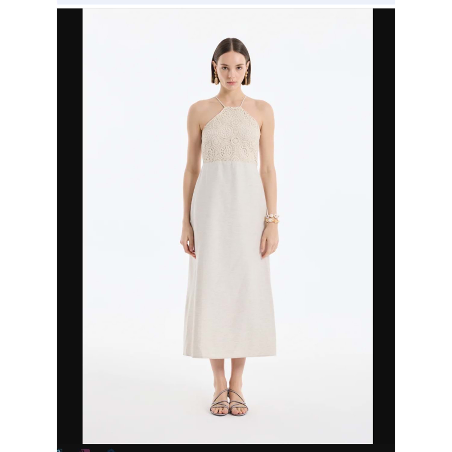 Göğüs kısmı dantel detaylı, sırt dekolteli, boyundan düğme kapamalı, halter yaka ince askılı, yandan fermuar kapamalı astarsız, uzun boy elbise. Kumaş Bilgisi Pamuklu %19, Polyester %45, Viskon %36